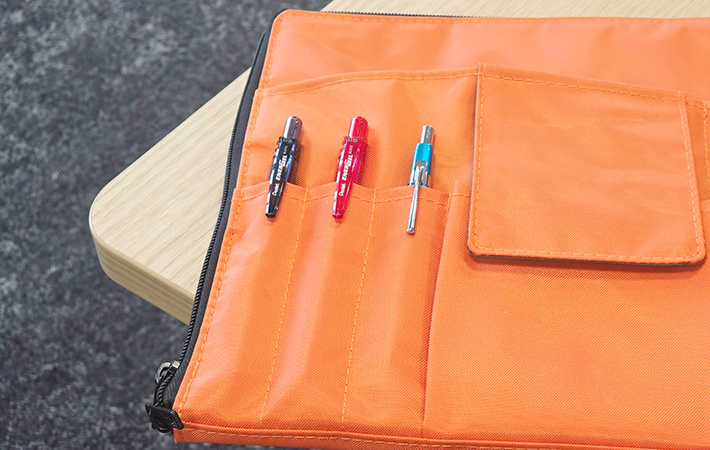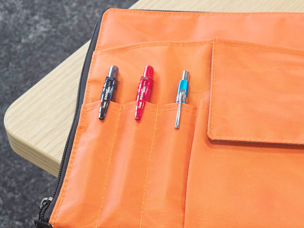 本記事で使用しているオレンジのほか、ブラックやブラウン、ネイビーといった落ち着いたカラーはビジネスシーンにもなじみやすく、黄緑のような明るい色はバッグの中でも視認性が高くなります。