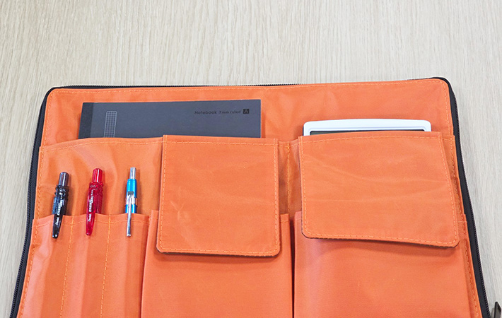 見ての通り、大小さまざまなサイズのポケットを備えているのが大きな特徴で、バッグの中のアイテムを用途ごとにしっかり仕分けできます。