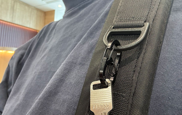 外側のゲートを開けてバッグのDカンや持ち手に通し、内側のゲートに鍵を引っ掛ける構造になっています。