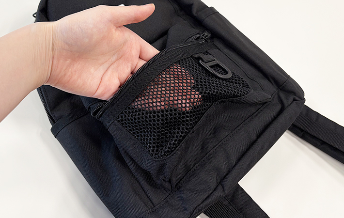 両サイドには小さなポケットがついていて、フロント部分にはファスナーつきのメッシュポケットがあります。