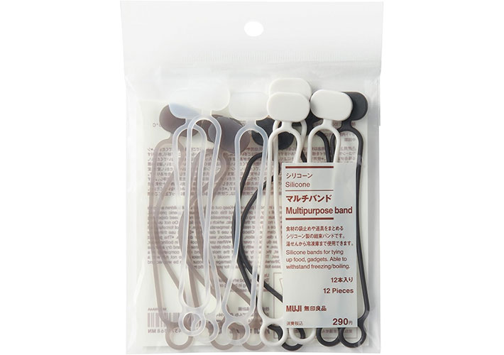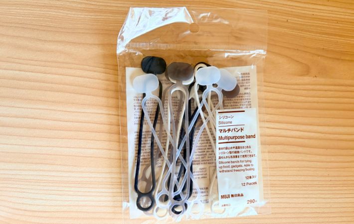 「正直なめてた…!」 SNSでバズってる『無印』アイテムがここまで便利だったとは 新着 By - endang 更新:2026-04-23 ※本記事はUPDATEが独自に制作したコンテンツです。また、本記事を経由して商品の購入が発生した場合に、ECサイト等から送客手数料を受領することがあります。 もともと『無印良品』が好きで、SNSもよくチェックしている筆者。 その中で何度か見かけて、ずっと気になっていたのが『シリコーン マルチバンド』です。 Amazonで『無印良品 シリコーン マルチバンド』を見る 楽天市場で『無印良品 シリコーン マルチバンド』を見る とはいえ、食品の袋を閉じる時は、これまでプラスチック製の留め具を使っていて、特に困っていたわけでもなく、「わざわざ買うほどでもないかな」と思っていました。 それでもやはり気になって試してみたところ、印象ががらりとチェンジ! まとめやすいだけでなく、使いやすくて、別の用途でも重宝しています。 今回はそんな『シリコーン マルチバンド』を、実際の使い方とあわせて紹介します。 目次 1. 『シリコーン マルチバンド』の基本情報2. 筆者が実際に使っている使い方2.1. お菓子や冷凍食品の袋を閉じる2.2. コード類をすっきりまとめる2.3. 手帳バンド+ペンホルダーとして使う2.4. 目印チャーム代わりに使う3. 実際に使ってみて感じたメリット3.1. ①輪ゴムよりもしっかり丈夫3.2. ②ベタつかない・絡まらないからストレスなし3.3. ③環境を選ばず使える4. 実際に使ってみて感じた気になる点5. 使ってみて初めてよさが分かる『シリコーン マルチバンド』 『シリコーン マルチバンド』の基本情報 『シリコーン マルチバンド』は、食材の袋止めや道具をまとめるのに使えるシリコーン製の結束バンド。サイズは幅1.8cm×長さ10.8cm×厚さ3.5mmほどです。 耐熱温度150℃、耐冷温度-20℃となっており、湯せんから冷凍庫まで使えるので、キッチンまわりでも気兼ねなく使えます。 見た目は輪ゴムのようですが、手に取るとしっかりとしたシリコーン素材。 実際に伸ばしてみると、想像よりもしっかり伸びるのに、伸びすぎることはなく、きちんとフィットする感覚があります。 無印らしいシンプルなデザインで、生活感が出にくいのも魅力の一つ。 ブラック、グレー、ホワイト、半透明のやさしい色味なので、キッチンでもデスクでも浮かず、自然となじみます。 使い方はとてもシンプルで、まとめたいものにクルッと巻いて、穴に引っ掛けて固定するだけ。 輪ゴムのように、大きな輪の部分に物を通して留めることもできるので、用途に合わせて使い分けができます。 筆者が実際に使っている使い方 使い始めてみると、「これにも使えるな」と自然に用途が広がっていきました。その中でも、特に出番が多い使い方を紹介します。 お菓子や冷凍食品の袋を閉じる まず一番よく使っているのが、お菓子の袋。 これまでは、ちょっとだけ残したスナックはプラスチック製の留め具で留めていました。 ただ、中身の量によってはうまく閉じられなかったり、かさばってしまうこともあって、少し扱いづらさを感じていました。 その点、このバンドは使い方の自由度が高いのがポイント。 上の部分だけを軽くまとめることもできるし、くるくるっと巻いてしっかり閉じることもできます。 袋のサイズや残り具合に合わせて使い分けられるのが、思っていた以上に便利でした。 コード類をすっきりまとめる 充電ケーブルやイヤホンをまとめる時にもよく使っています。 このバンドは輪っかがついているので、あらかじめケーブルを通しておけば、使っている時にも外れてどこかにいく心配がありません。 使い終わったら、そのままくるくるっと巻いて留めるだけ。 まとめるまでの動作がスムーズなので、ズボラな筆者でも自然とまとめる習慣がついた気がします。 スマホの充電ケーブルだけでなく、ドライヤーやテレビまわりのコードなど、少し長さのあるものにも使えるので、家の中のごちゃつきが気になる場所にも取り入れやすいと感じました。 手帳バンド+ペンホルダーとして使う 手帳やノートにくるっと巻いて、簡易的なバンドとして使うのも定番になっています。 バッグの中で開いてしまうのを防げるだけでも便利ですが、さらに使いやすいと感じたのがペンホルダーとしての使い方です。 丸い穴の部分にペンを差し込めるので、いざ書こうとした時に「ペンがない」ということがなくなりました。 手帳とペンをセットで持ち歩けるようになるだけで、ちょっとしたストレスが減った気がします。 目印チャーム代わりに使う 個人的に一番気に入っている使い方が、目印チャーム代わりに使うこと。 外出先で、自分の傘がどれか分からなくなってしまったり、冷蔵庫にあるペットボトルも「どれが自分のか」と迷ったりした経験、ありませんか。 そんな時に、このバンドを一つつけておくだけで、パッと見て自分のものだと分かります。 目印チャームはキャラクターものなど