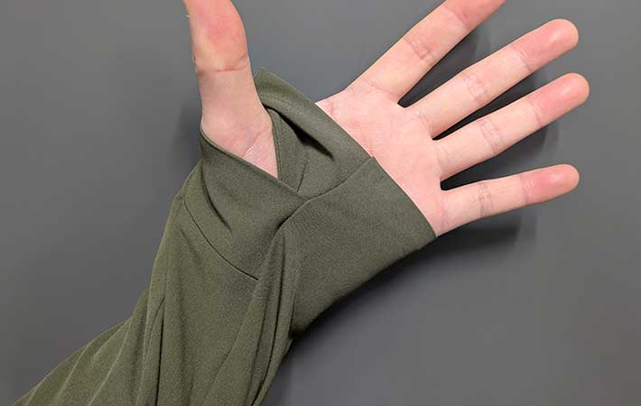 袖には親指を出せるサムホールがついているので、ちょっと肌寒い時や日差しが気になる時など、しっかりと手のひらまで隠したい時に役立ちます。