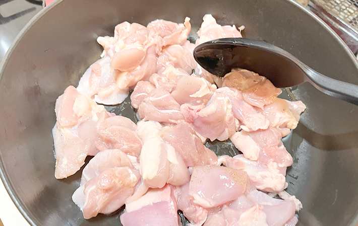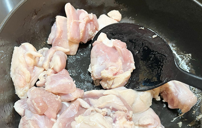まずはゴロッと切った鶏肉を炒める工程から。