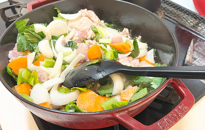 玉ねぎやにんじん、じゃがいもなど、大きさや固さがバラバラの食材を一気に炒める場面でも快適に使えます。