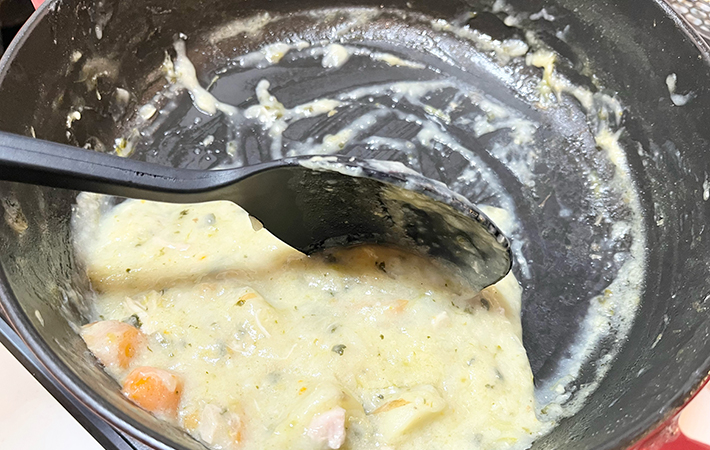 しなやかなシリコーンゴムが鍋肌にしっかりフィットし、残ったシチューを最後まで無駄なくきれいに集めることができるのです。