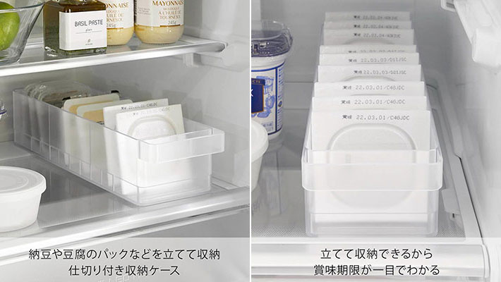 納豆、豆腐パック、もずくパック、スライスチーズなど、四角い食品を立てて収納でき、見た目も整理される上にさっと取り出しやすいのが嬉しいポイント!