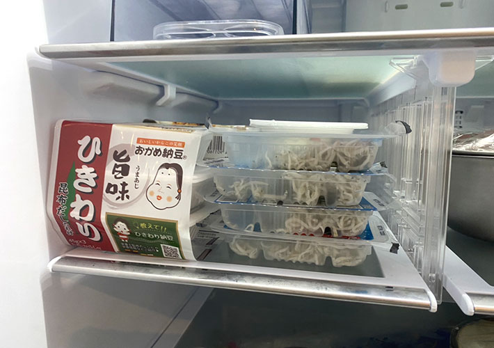 納豆としらすパックで埋め尽くされた冷蔵棚