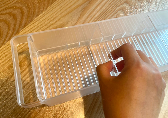 冷蔵庫の奥まで無駄なく使えるワイドな奥行きが特徴の収納ケースで、可動式の仕切りがついているのが使い勝手抜群なんです。