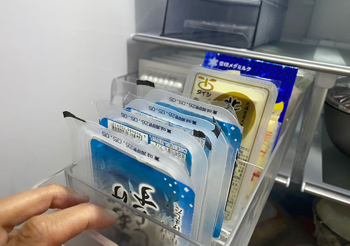 片方にはしらすパックを収納し、少なくなってきたら仕切って余ったスライスチーズなどを入れています。