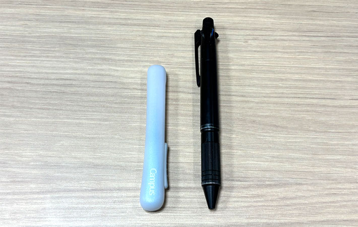 そんな『キャンパス キャップのない携帯ハサミ』は見た目がスリムで、ペンと並べても違和感のないサイズとなっています。