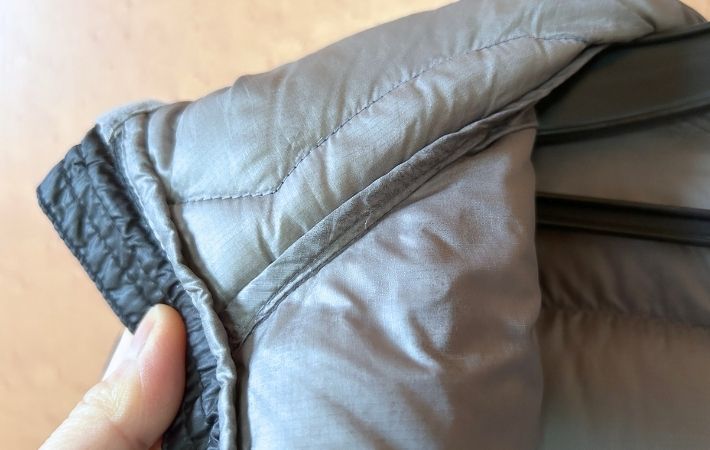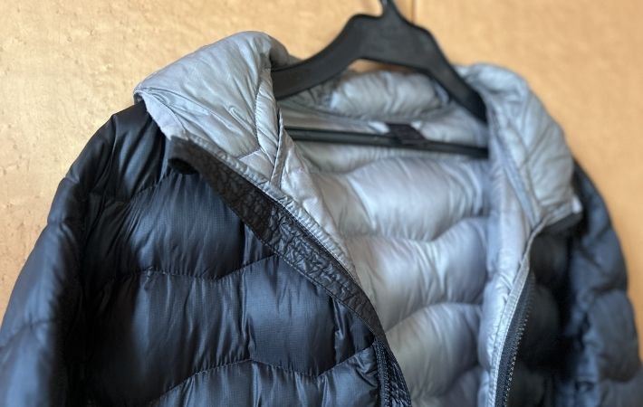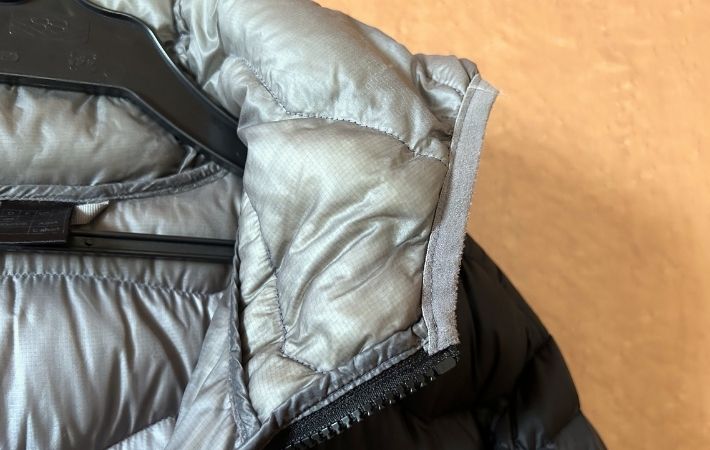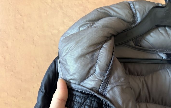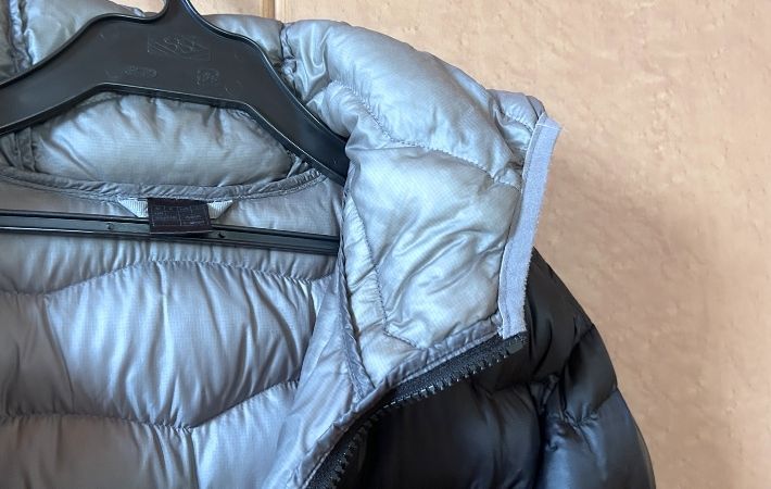 首元あたりが、くっきりとした黄ばみに覆われているダウンジャケット。