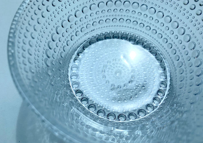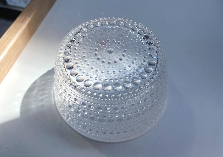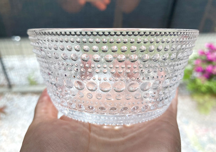 ・窓ガラスの雨粒や寒い日の結露をそのまま食器にしたような美しさです。厚みがあり丈夫そうなのと、粒々のおかげで手に取った時に滑りにくいのもいい。