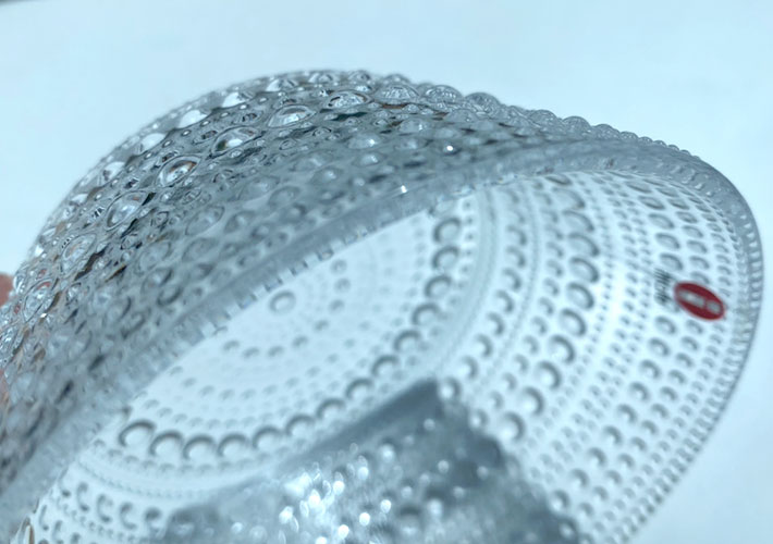 丈夫でシンプルなデザインである磁器製の『ティーマ』の一方で、カステヘルミは繊細な装飾と美しい透明感が魅力のガラス製。