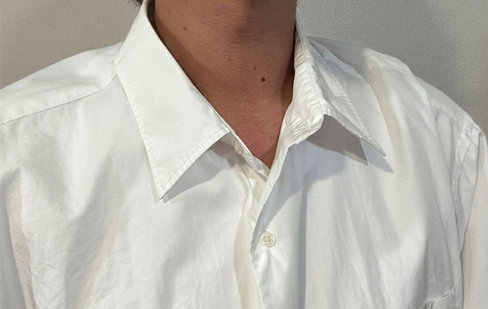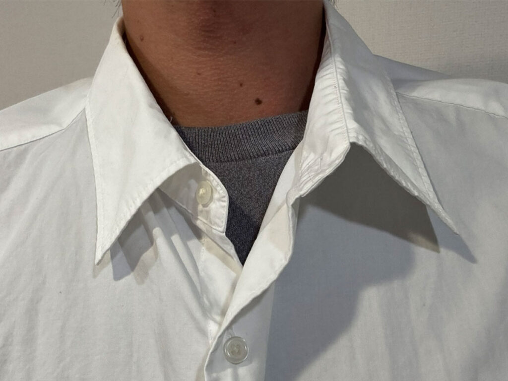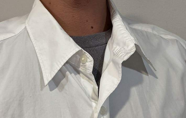 首元から丸首Tシャツの縁がのぞいていると、それだけでどことなく野暮ったい印象になってしまいます。