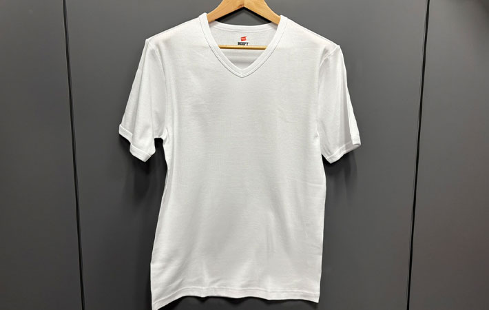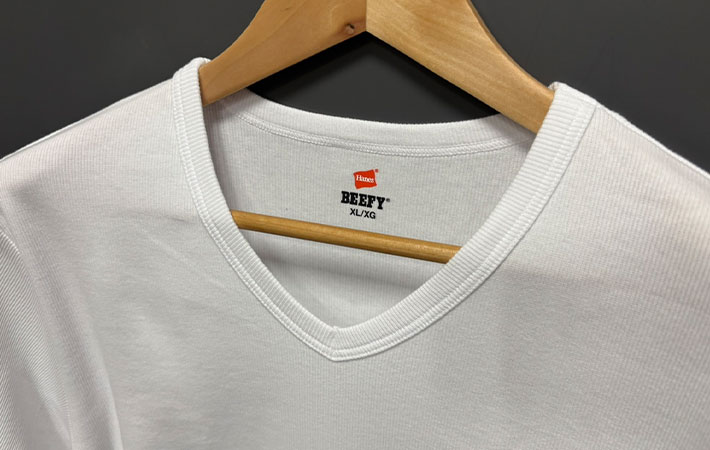 ヘインズの『ビーフィーリブVネックTシャツ』なら、Vネックらしく首元がスッキリし、着心地も耐久性もしっかりと設計されています。