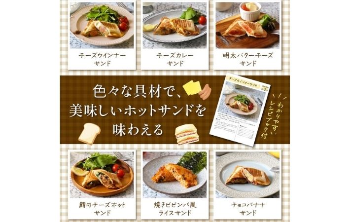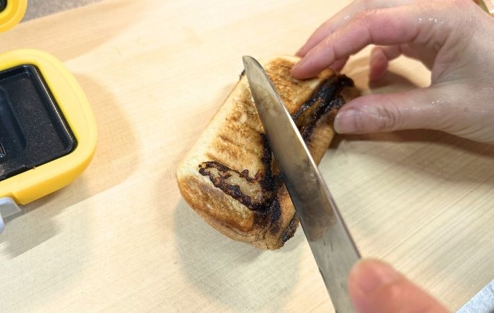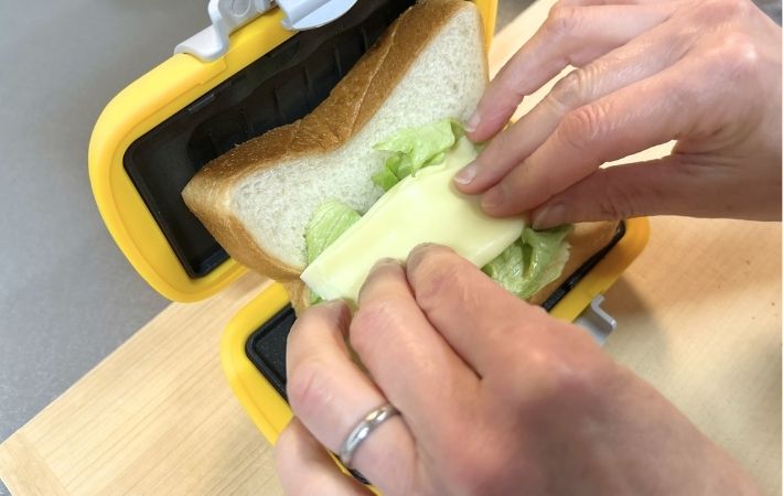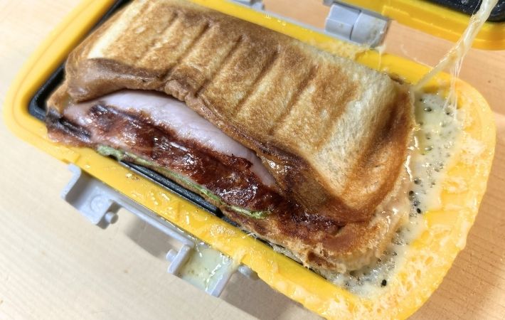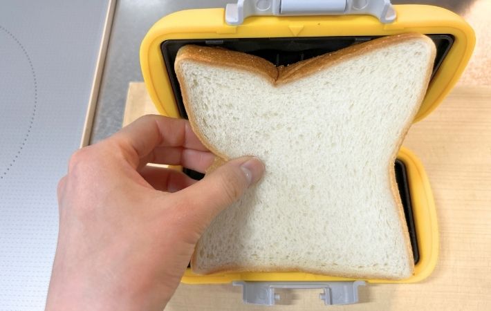 一般的なホットサンドメーカーはパンを2枚使いますが、こちらは食パン1枚を折りたたんで作るスタイルです。