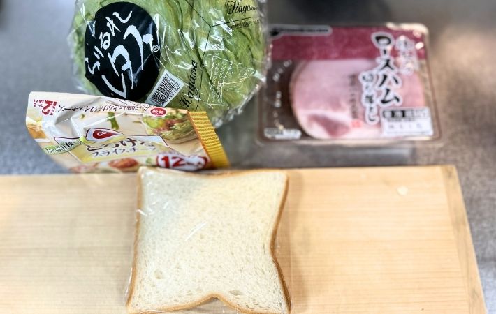 最初は『しょっぱい系』から。具材はスライスチーズとシャキシャキのレタス、そして旨みたっぷりのハムを用意しました。