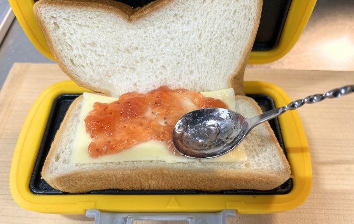 食パンにチーズを乗せてジャムをたっぷり塗ったら、ギュッとプレス。電子レンジ600Wで3分加熱します。
