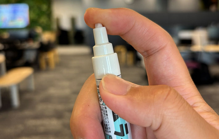 初めて使う時は、まず『ラベケシ』を上向きにして、親指で1度プッシュして空気を抜きましょう。続いて、ペン芯全体が水色に染まるまで30〜50回ほどプッシュ。