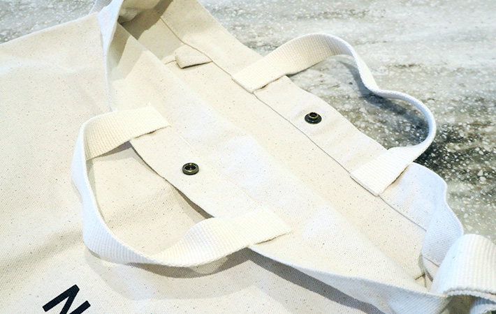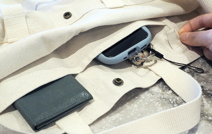 開口部にはスナップボタンがついているため、物が飛び出してしまう心配も少なめです。ハンドルつきなので手持ちでサッと運ぶこともできますよ。