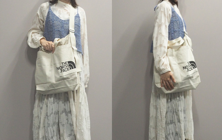 一方、『オーガニックコットンショルダー』は自然な風合いの生地のため、カジュアル系はもちろん、少しフェミニンな服装にも馴染んでくれます。