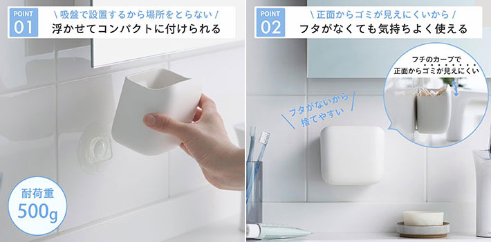 マーナの『洗面ゴミ箱』は、洗面所の壁面に吸盤で設置できる浮かせるゴミ箱。
