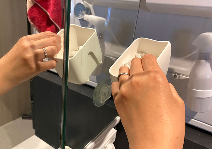 ・歯間フロスを使った後、毎回洗面所からリビングのゴミ箱まで捨てに行くのが地味にストレスでした。この吸盤式ゴミ箱を鏡につけてからは、その場でサッと捨てられて快適です。