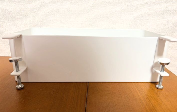 調節ネジで固定する仕様で、取りつけ方はシンプル。対応する天板は厚さ1.2〜5cm、幅27cm以上、奥行き4cm以上です。