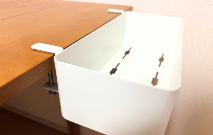『テーブル横バスケット』は、テーブルの側面に取り付けて使う収納アイテム。