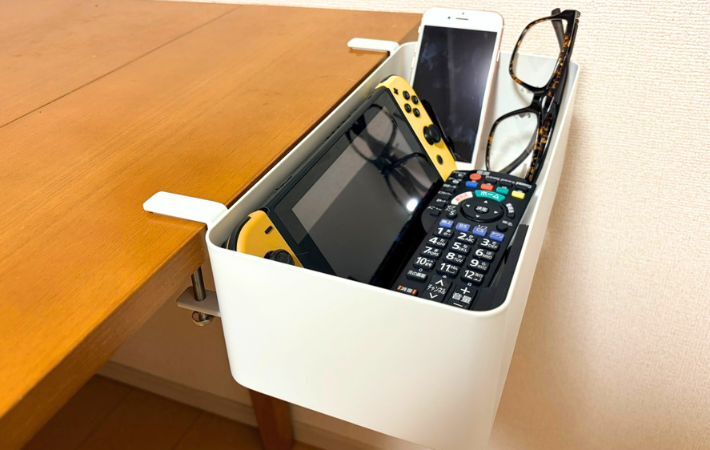 「リモコンやメガネで散らかる…」 テーブル横にこのバスケットを取りつけたら「この手があったか」「快適すぎる」 生活雑貨 By - 西岡舞子 更新:2026-04-28 ※本記事はUPDATEが独自に制作したコンテンツです。また、本記事を経由して商品の購入が発生した場合に、ECサイト等から送客手数料を受領することがあります。 リビングやデスクの天板は、気づくと小物でいっぱいになりがちです。 リモコン、メガネ、タブレット、文房具、飲み物など、手元に置きたい物は多いもの。置けば置くほどスペースは狭くなり、作業や食事のたびに「ちょっと邪魔かも…」と感じることもありました。 そこで注目したのが、『山崎実業』の『テーブル横バスケット』です。 天板の上ではなく、横に収納を作ることでスペースをすっきり使えるアイテム。実際に使ってみると、想像以上に快適でした。 スリムに見えて、しっかり実用的 Amazonで見る 楽天市場で見る サイズ(約):幅30cm×奥行18cm×高さ9.5〜11cm 内寸(約):幅29.8cm×奥行13.8cm×高さ8.9cm 重さ(約):1020g 耐荷重:5kg 『テーブル横バスケット』は、テーブルの側面に取り付けて使う収納アイテム。 天板の上に物を置くのではなく、横に逃がして収納できるのが特徴です。 調節ネジで固定する仕様で、取りつけ方はシンプル。対応する天板は厚さ1.2〜5cm、幅27cm以上、奥行き4cm以上です。 ネジをくるくると回していくだけで、工具なしでも簡単に設置できます。 見た目はすっきりしているのに、日常使いには十分な収納力。デスクやダイニングテーブルだけでなく、ソファやチェアのアームレストにも取りつけられるので、使い方の幅もかなり広そうです。 カラーは2色展開。筆者はどんなインテリアにも馴染みやすいホワイトを選びましたが、ブラックも選べます。 Amazonでブラックを見る 楽天市場でブラックを見る 小物の定位置が作れる 早速収納してみたのは、リモコンやメガネ、タブレット端末、ゲーム機など、リビングで散らかりがちなアイテム。 普段から「あれどこだっけ?」と探すことが多かったものも、居場所を決めておくだけで、必要な時にすぐ手に取れるようになりました。 テーブル上で意外と場所を取ってしまうボックスティッシュもすっぽり収まるサイズ感。 細かな物と一緒にまとめて収納できるので、テーブルを拭くたびに1つずつ移動させる手間も減りました。 趣味のアイテムをまとめておくのにも便利。 仕事中に気分転換でネイルケアをすることが多い筆者は、ごちゃつきがちなネイル道具を入れてみました。 細かなアイテムがまとまることで、デスクもすっきり。次に使用する際も見失うことがありません。 収納しながら充電できるのも便利 使ってみて便利だと感じたのが、ケーブルを通せる設計。スマートフォンやタブレットなどを充電しながら収納できます。 机の上にケーブルと端末が広がりにくくなるので、見た目のごちゃつきも軽減。 なお、対応するケーブル端子サイズは幅2.5cm×奥行き1.2cm以内なので、購入前に確認しておくと安心です。 テーブルの『使えるスペース』が増える感覚 『テーブル横バスケット』は、テーブル上の物をただ片付けるのではなく、収納スペースそのものを増やしてくれるのが強み。 天板の上がすっきりすることで、作業や食事のためのスペースも確保しやすくなります。 シンプルな見た目と使い勝手のバランスもよく、「ここに置きたい」という場所に簡単に設置しやすいのも魅力。一度使うと手放せなくなりそうです! Amazonで見る 楽天市場で見る [文・構成/UPDATE編集部] 出典 Amazon/楽天市場 関連ワード 収納山崎実業検証 この記事をシェアする Share Post LINE