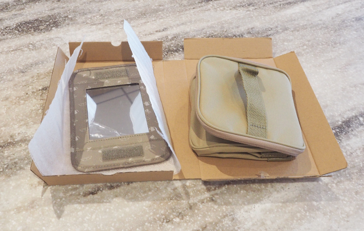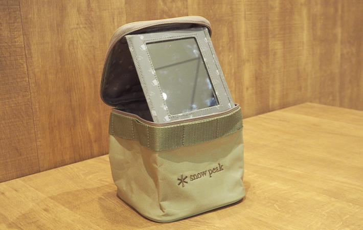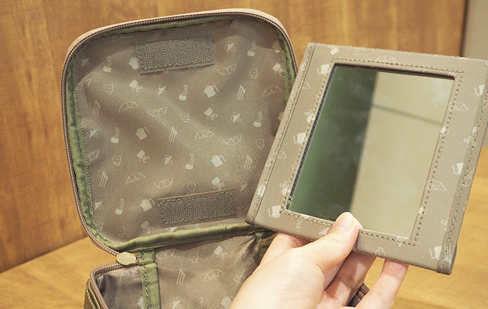 マジックテープでつけ外しできるミラーは、ポーチに立てて使えます。旅先はもちろん、鏡のないアウトドアシーンでも、これ1つでサッとメイクができますよ。
