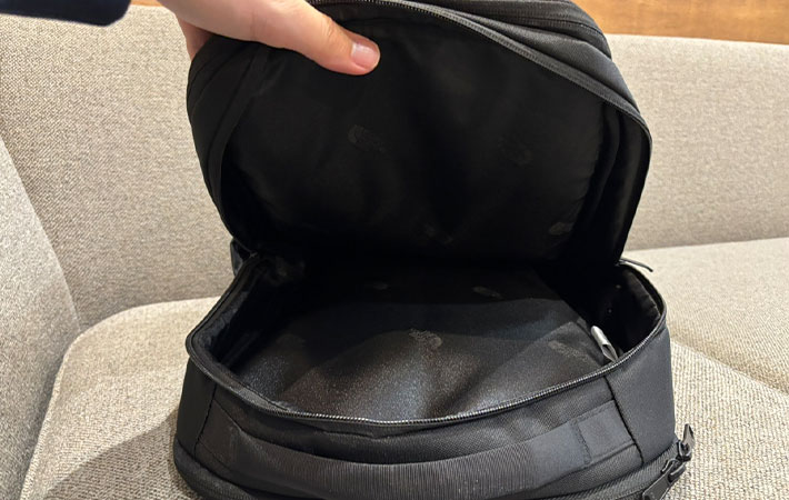 背中側のPCスリーブはラウンドファスナーがほぼ全周についており、3つのコンパートメントの中で最も大きく開きます。