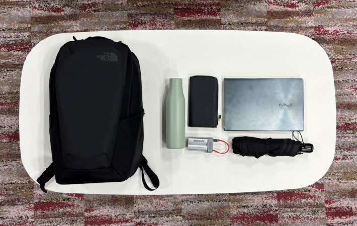 普段リュックに入れているノートパソコン、財布、大きめの水筒、折りたたみ傘、モバイルバッテリーを入れてみたところ、全部入った上で余裕たっぷりでした。