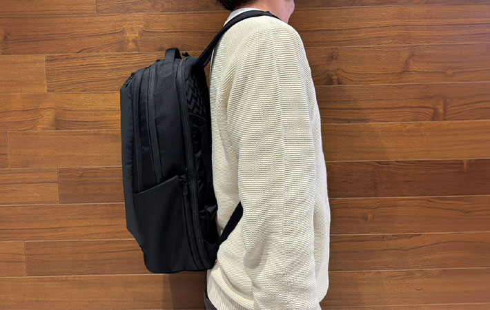 側面から見ると、25Lの容量がありながらも極端な厚みを感じさせないシルエットです。