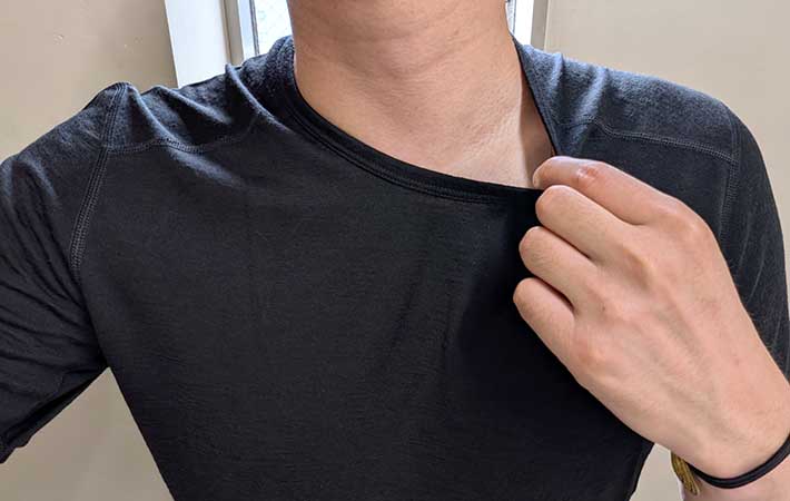 ストレッチ性はあまり高くはありませんが、汗染みに関してはかなり優秀で、汗をかいてもほぼ目立ちませんでした。