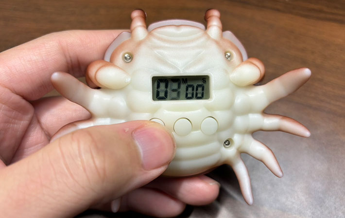 ただのタイマーではありません。カニの形をしたキッチンタイマーで、手のひらにすっぽり収まるほどのコンパクトさ。カニとしては小柄な部類です。