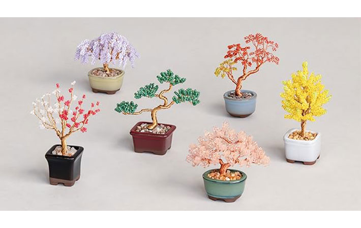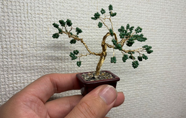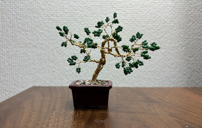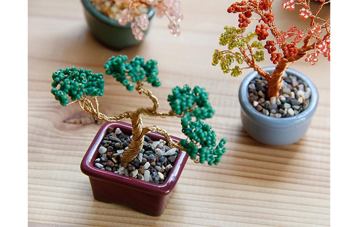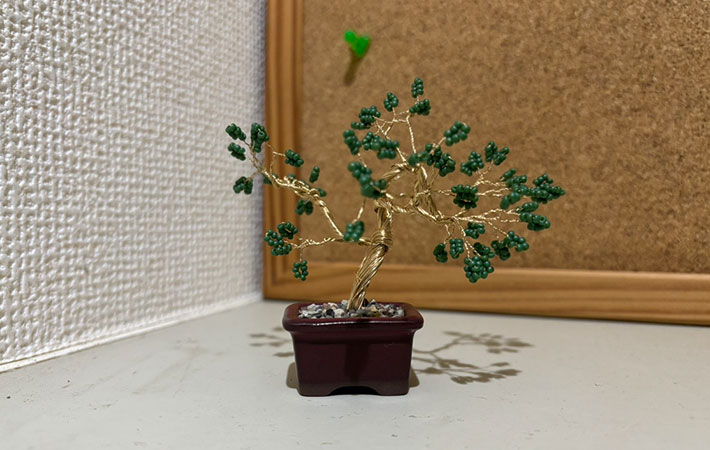 本物の鉢に収まったビーズの盆栽は、小さいながらも存在感があり、インテリア雑貨としてそのまま通用するバランス感です。