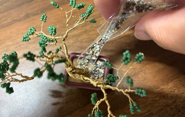 葉はビーズ、枝はワイヤーで作られていますが、鉢と砂利は陶器と本物の石になっていてかなり本格的。