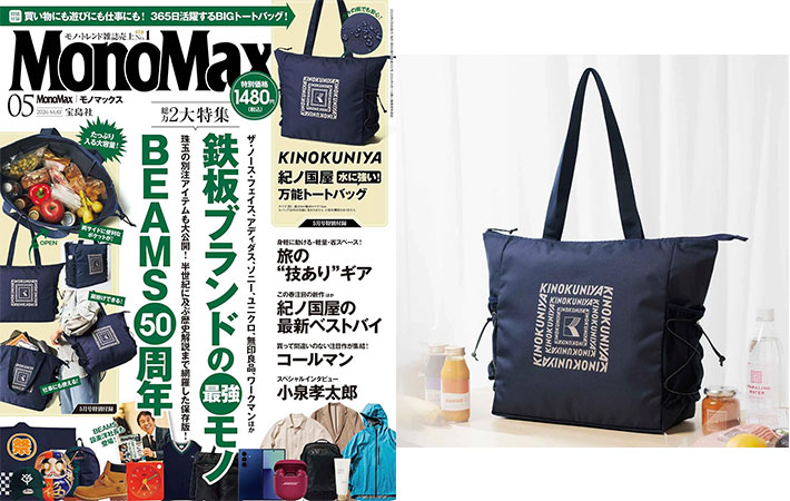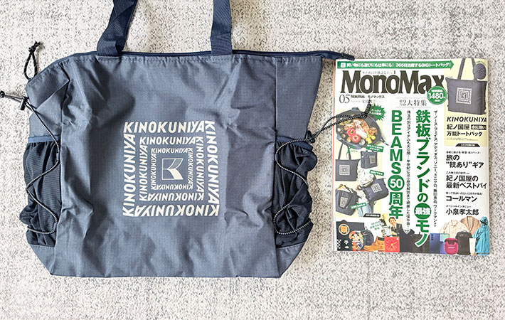 『MonoMax』2026年5月号の付録は、紀ノ国屋とのコラボによる『水に強い!万能トートバッグ』です。