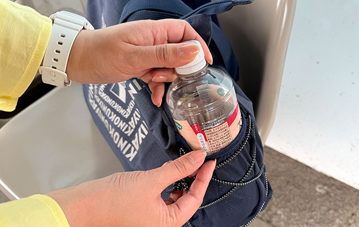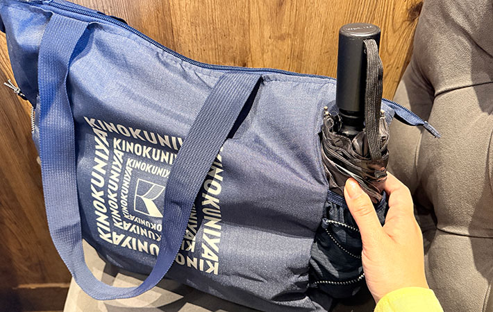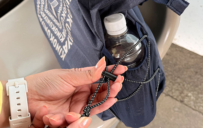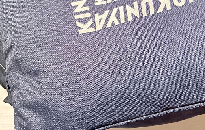 はっ水加工が施されているので、多少の水滴ならへっちゃら。ペットボトルや濡れた折りたたみ傘の水滴を気にせず入れられるのは、とても気楽です。