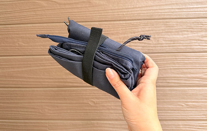 こんな感じで折りたたんでゴムバンドなどで留めれば、エコバッグのように持ち歩けるので便利です。