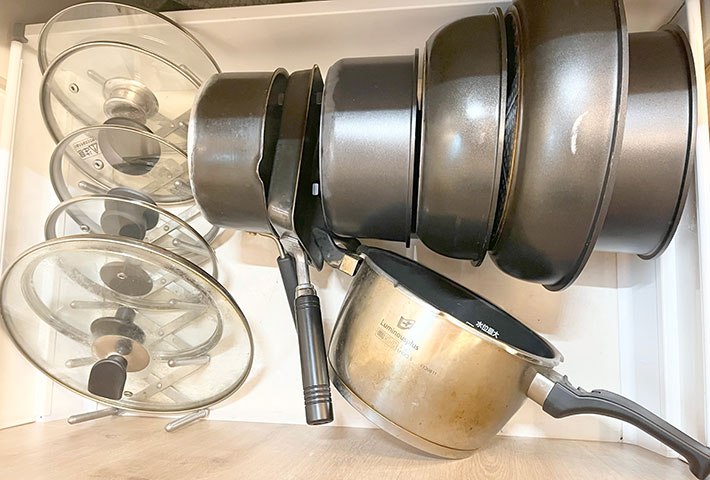 筆者もまさにその1人。使いにくいとは思いつつ、フライパンはこのように無造作に重ねて収納していました。