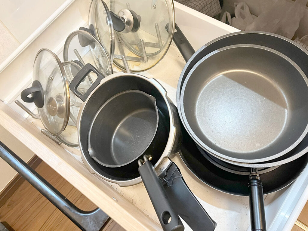 手持ちが多くすべては収まりきらなかったものの、使いたいフライパンをスッと取り出せるようになりました。